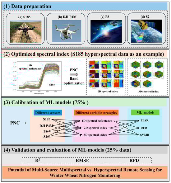 This study contributes to precision agriculture by systematically comparing the effectiveness of UAV hyperspectral, UAV multispectral, and satellite multispectral sensors for PNC estimation. By employing spectral resampling to simulate multispectral data for the popular platforms (DJI Phantom 4 Multispectral (DJI P4M), PlanetScope (PS) and Sentinel-2A (S2)) from the S185 UAV hyperspectral data, this study bridges the gap between high-precision UAV systems and scalable satellite remote sensing technologies. PNC estimation models were constructed using 1D spectral reflectance and optimized 2D and 3D spectral indices from different sensors combined with PLSR, RFR, and SVMR algorithms, respectively. The primary objective was to assess the potential of different remote sensing technologies for estimating winter wheat PNC, considering cost, accuracy, and regional applicability.