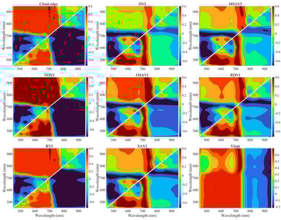 Correlation heat maps between PNC and 2D spectral indices from the S185 sensor. Each subplot’s color bar on the right displayed the correlation (R) values. The wavelengths at 450–950 nm were represented by the x- and y-, z-axes.