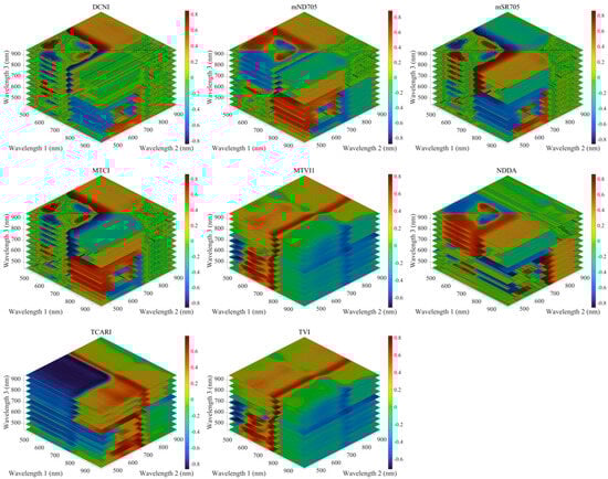 Previous research has successfully developed numerous spectral indices to assess crop growth parameters with satisfactory results []. In this study, 17 spectral indices, both 2D and 3D, were constructed. To identify the most informative band combinations for these indices, band optimization algorithms were employed. Specifically, these algorithms iteratively evaluated all possible combinations of spectral bands within the given range and selected those showing the strongest correlation with PNC. For 2D spectral index, pairs of spectral bands were analyzed, while for 3D spectral index, triplets of bands were systematically assessed (Figure 2). Heatmaps of 2D and 3D correlation coefficients were then generated using MATLAB R2023a (MathWorks, Natick, MA, USA) to visualize the relationships and highlight the optimal band combinations. The specific definitions and band optimization algorithms are provided in Table 3.