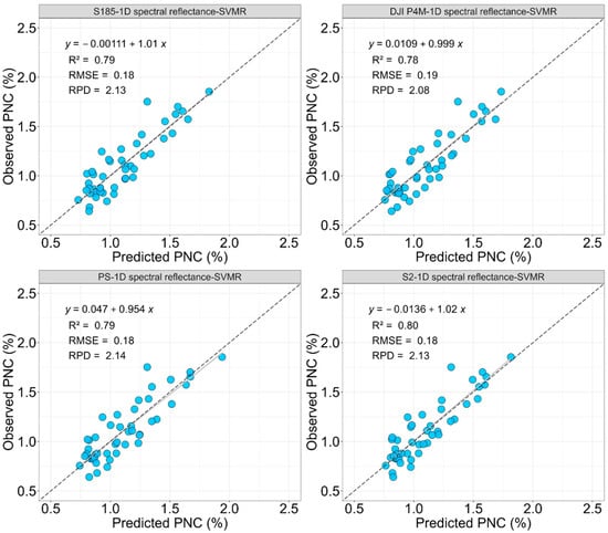 Scatter plots of observed vs. predicted PNC (%) for the best models based on 1D spectral reflectance derived from different sensors. The gray line indicates the regression fit, and the dashed line denotes the 1:1 line.