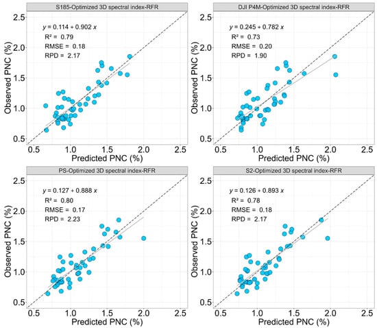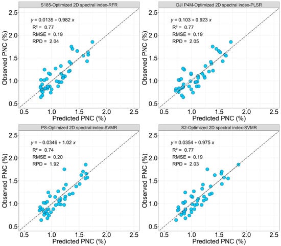 Scatter plots of observed vs. predicted PNC (%) for the best models using optimized 2D spectral indices derived from different sensors. The gray line indicates the regression fit, and the dashed line denotes the 1:1 line.