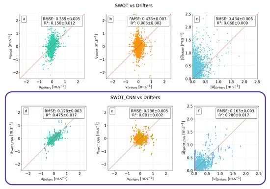 Scatter plots of the zonal (a,d,g,j,m), meridional (b,e,h,k,n), and total currents (c,f,i,l,o) SWOT vs. Drifters (a–c), SWOT filtered by our model vs. Drifters (d–f), SWOT denoised by the Gómez method vs. Drifters (g–i), SWOT_L3 product vs. Drifters (j–l), and DUACS vs. Drifters (m–f). A frame is added around the scatter plots involving our method to highlight the results. The RMSE and R2, along with their confidence interval (±2 standard deviations), are displayed on each plot. RMSE is expressed with units in .