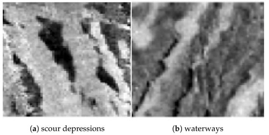 Inter-class similarity sample: the “scour depressions” (a) display geomorphological features close to “waterways” (b).