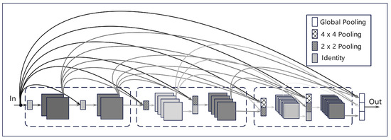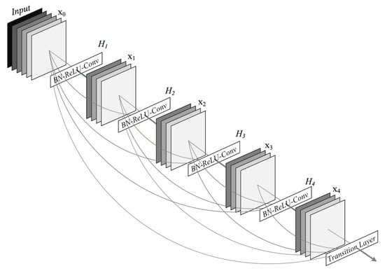 In the DenseNet structure, the information added to the network differs significantly from the information retained. Each convolutional layer in a dense block is narrow (e.g., using 12 filters per layer) and only adds a small number of feature maps to the network’s collective knowledge, which are then retained throughout the layers. Unlike traditional network structures, where layers have unidirectional connections, DenseNet employs multiple connections between layers, resulting in connections for L layers. The convolution operation in the dense block is represented by , where … is the convolution layer of the preceding l layer, is the output, and is the set containing nonlinear transformation, including convolution, pooling, and ReLU as illustrated in Figure 6. Each dense block consists of a series of 1 × 1 and 3 × 3 convolution layers with the same padding for cascading operations.