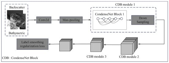 Our refined method was tested on datasets incorporating backscattering and bathymetric topographic data, utilizing their multi-source potential to boost representational power without substantially increasing model parameters. The input data flows through an initial convolutional layer, followed by a max-pooling layer, which leads to dense connection layers. Transition layers, equipped with 1 × 1 convolutions and average pooling with a stride of 2, adaptively downsample feature maps. Downsampling occurs three times within the network using CondenseNet’s structure. This strategic design maintains computational efficiency while preserving key spatial features. Finally, the enhanced LSR based cross-entropy loss function minimizes interclass similarity issues, refining feature extraction and significantly improving classification accuracy.