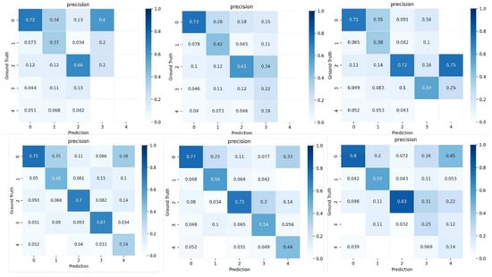 The confusion matrix of AlexNet, VGG, ResNet (Top, left to right) and DenseNet, ConDenseNet with LSR with Backscatter data only and with Backscatter and bathymetric data (Bottom, left to right). (0) Continental shelf, (1) Rock, (2) Depression, (3) Waterway, (4) Ocean ridge.