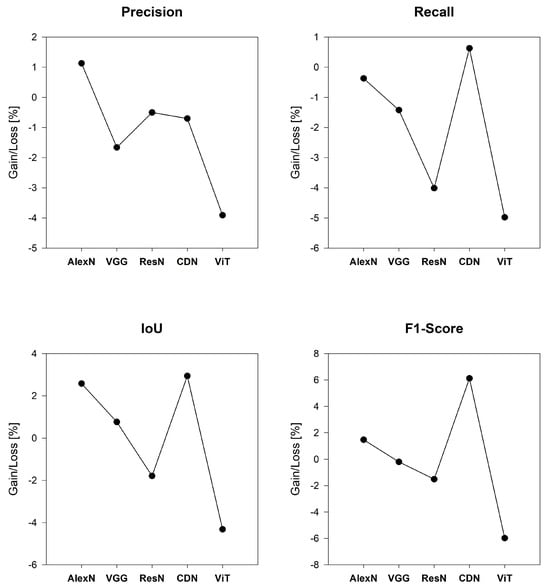 The gain/loss plots of AlexNet (AlexN), VGG, ResNet (ResN), ConDenseNet (CDN) and ViT with and without LSR in Precision, Recall, IoU and F1-Score.