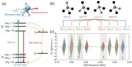 - Doherty, M.W.; Manson, N.B.; Delaney, P.; Jelezko, F.; Wrachtrup, J.; Hollenberg, L.C.L. The nitrogen-vacancy colour centre in diamond. Phys. Rep. 2013, 528, 1–45. [Google Scholar] [CrossRef]
