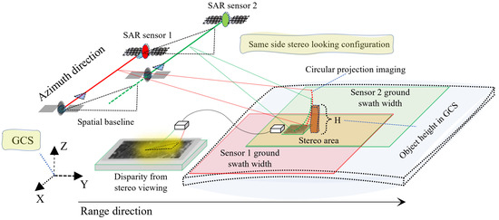 General structure of same-side stereo imaging using the radargrammetric approach in SAR images. GCS is short for geographic coordinate system.