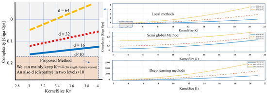 Graphical comparison of the computational complexity of dense matching algorithms by varying the basic parameters (disparity value d and the kernel size ).