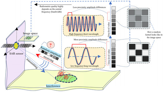 Radiometric resolution comparison between SAR images with higher (X-band) and lower (C-band) central frequencies.