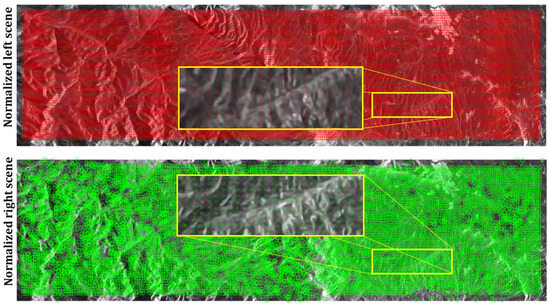 Further, the large baseline of the dataset introduces incidence angle variations between identical pixels in the two images, exacerbating geometric distortions. The ground spatial resolution is 10 m (range and azimuth), covering a broader area than higher-resolution imagery. Although TerraSAR-X data (1–2 m) are often resampled to 10 m to mitigate speckle effects [17], the proposed algorithm can be adapted to higher-resolution data with minor modifications.