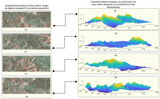 Anaglyph images of subsets A1 to A4 and corresponding elevation models B1 to B4 (4 of 8 subsets).