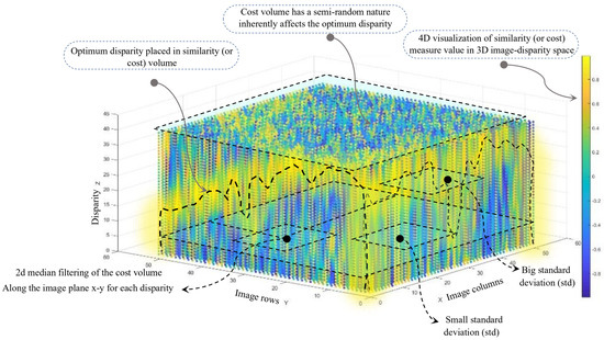 In SGM, the cost function extends the basic local similarity metric by incorporating regularization terms to enforce smoothness in the disparity map. This makes it a quasi-global method [59,60]. As depicted in Figure 10, the generated cost volume exhibits pseudo-random behavior; hence, regularization is necessary to obtain coherent disparity maps.