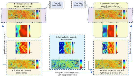 Despite its potential, radargrammetry must contend with challenges less pronounced in optical stereo imaging. These include speckle noise [25], lower radiometric resolution, weaker texture patterns, and geometric distortions, such as foreshortening, layover, and shadowing. Radargrammetric elevation accuracy is highly sensitive to the precision of the pixel-matching process, particularly in same-side stereo configurations. Addressing these challenges begins with effective speckle reduction, which improves radiometric quality and facilitates more reliable matching.