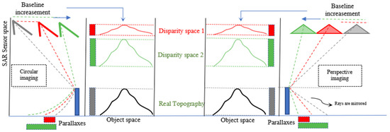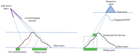 Radargrammetry, an alternative approach, leverages intensity information rather than phase, drawing on photogrammetric principles [14,15,16,17,18,19,20]. As illustrated in Figure 1, same-side stereo imaging is preferred because of its radiometric consistency, avoiding distortions inherent in opposite-side configurations. Although SAR and optical imaging share geometric similarities, SAR’s ground-to-image projection is circular rather than perspective [15,21,22,23,24].