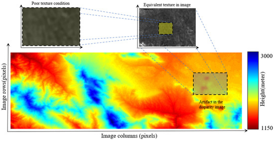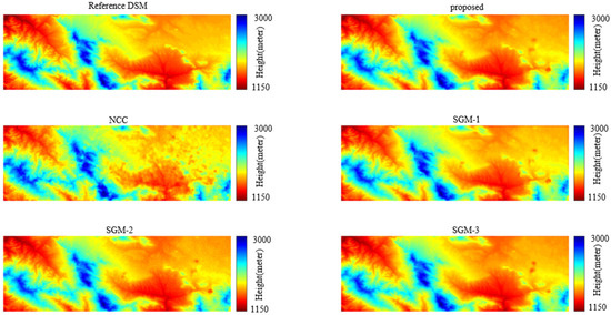 In the second stage, a pair of TerraSAR-X stereo images was utilized to further analyze the performance of the proposed algorithm alongside other benchmarked methods. Acquisition parameters are listed in Table 3. As illustrated in Figure 9, severe distortions—especially across mountainous regions—have arisen due to the area’s topographic conditions. To mitigate these effects and reduce the influence on the output results, the normalized images used in the dense matching stage were epipolar resampled based on a DEM-driven approach [27].
