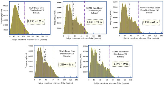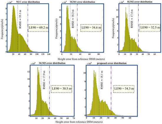 Although the proposed structure may be less effective than semi-global methods in regions with abrupt elevation changes, the integration of a dedicated post-processing stage helps suppress unwanted distortions in the final model. It is noteworthy that height model generation in areas with significant elevation variability—such as urban environments—using SAR intensity imagery has recently gained attention. Therefore, adapting dense matching algorithms to achieve performance comparable to those used in optical imagery warrants further investigation. As demonstrated in Table 12 and Table 13, leveraging an adaptively sized kernel window could address the trade-off between pixel-level matching precision and smoothing behavior. This approach, which may offer an alternative to the two-stage design, should be considered in future research. Additionally, due to the high computational load involved in both cost function computation and aggregation in the SGM algorithm, incorporating the proposed algorithm into its framework may retain its stability while significantly reducing computational complexity.
