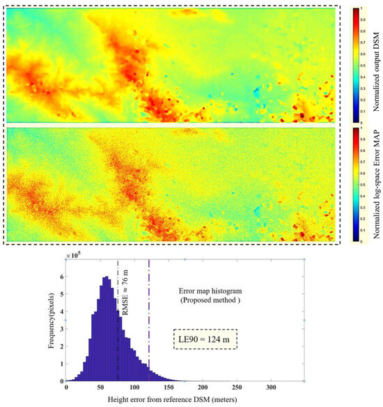 Since the elevation model used as the reference DSM for the Sentinel-1 image was acquired as a nationwide surface coverage, the same model was employed to assess the geolocation accuracy of the TerraSAR-X data over the Tehran region. Additionally, to enable epipolar resampling, an SRTM elevation model with a 30 m vertical resolution was utilized. As shown in Figure 9, layover-affected regions of the test area have been excluded from the evaluation section to facilitate more accurate result analysis.