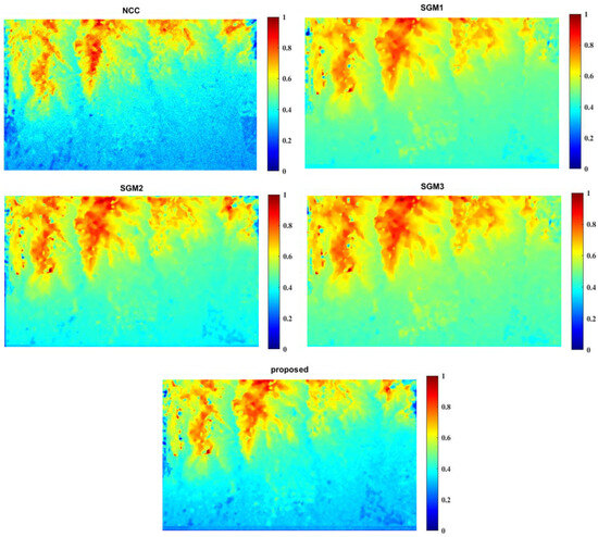 Such structural limitations also influence the stereo-matching process, particularly the γ parameter in Equation (22). Although a nominal value of 0.5 is commonly used for estimating ideal accuracy, it cannot be assumed that all pixels conform to this level of precision. Among the influential parameters is the kernel size used during matching. To achieve optimal performance, both the proposed algorithm and conventional local methods are tested with varying kernel sizes, selecting the configuration that yields the best output. However, uniform kernel sizes across the image may not result in uniform accuracy. A kernel that performs optimally in one region may not be ideal elsewhere, particularly across heterogeneous landscapes.