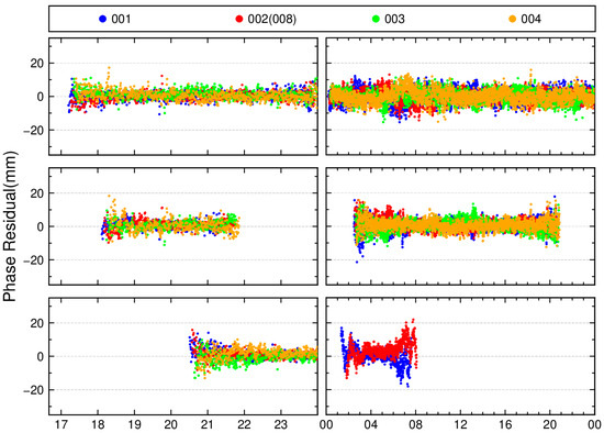 - MEO satellites (e.g., C14) have a longer revisit period of about seven sidereal days. The C14 residuals in Figure 4 illustrate that residual patterns on Day 001 vs. Day 002 (adjacent days) differ significantly in both shape and time coverage (because the satellite’s pass times differ), whereas Day 001 vs. Day 008 (seven days apart) show much higher correlation and more similar trends. This is consistent with the ~7-day repeat cycle for BDS MEO orbits.