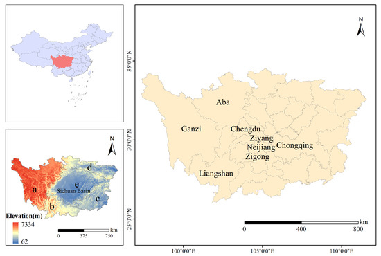 Sichuan Basin and peripheral area and its sub-regions (a: the western Sichuan plateau; b: the southern edge red bed zone; c: the eastern Sichuan ridge valley zone; d: the northern foothill transition zone; e: the basin area).