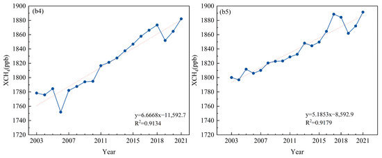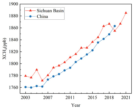 The multi-year average of XCH4 in the Sichuan Basin from 2003 to 2021 is shown in Figure 4. The regional concentration reached its lowest point in 2006 (1771.50 ppb) and its highest point in 2021 (1885.02 ppb), with an overall increasing trend of 6.138 ppb. It is clear that the Sichuan Basin region has a higher value of XCH4 than China throughout the study period. Here, XCH4 data over the whole of China come from the research of Xu et al. [37]. The global atmospheric CH4 concentration started to increase in 2006 [38], which coincided with the increase in regional atmospheric CH4 concentration in 2006, which is similar to the global atmospheric methane concentration. In addition, the regional XCH4 concentration decreased in 2006, possibly due to lower methane concentrations from reduced oil and gas emissions and fossil fuel combustion [39]. In addition, studies that include methyl chloroform measurements indicate that OH sinks have increased, counteracting the increase in methane emissions [40,41].