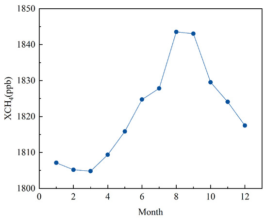 The multi-year monthly average XCH4 revealed that the regional methane concentration in the Sichuan Basin reached its highest value in August (1843.54 ppb) and its lowest value in March (1804.81 ppb) (Figure 5). Atmospheric methane concentrations increased from March to August, followed by a decrease after August. The highest methane concentrations occurred in August and September, which was attributed to the higher methane emissions from rice paddies in the Sichuan Basin during the summer and fall. A clear seasonal fluctuation can be seen in the Sichuan Basin (Table 2). The mean value of concentration is highest in fall (1832.21 ppb), followed by summer (1832.04 ppb), spring (1810.02 ppb), and winter (1810.00 ppb), showing a pattern of higher values in summer and fall and lower values in winter and spring. This pattern is similar to the seasonal mean of XCH4 concentration in the whole Chinese region [37,42].