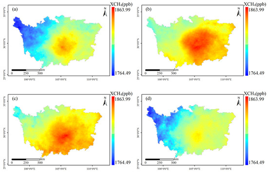 Seasonal distribution of XCH4 in the Sichuan Basin during 2003–2021: (a) spring; (b) summer; (c) autumn; (d) winter.