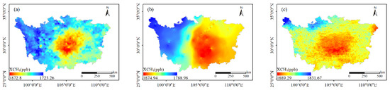 Annual average spatial distribution of XCH4 data from three satellites/sensors in the Sichuan Basin from 2003 to 2021: (a) XCH4 during 2003–2010; (b) XCH4 during 2011–2018; (c) XCH4 during 2019–2021.