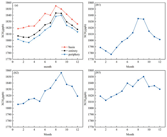 The monthly average XCH4 values for each region of the Sichuan Basin from 2003 to 2021 show that XCH4 values in the basin area are about 20 ppb higher than in the surrounding areas (Figure 12). The trend of monthly XCH4 averages was similar in regions b and e, both peaking in September and reaching a minimum in May. In contrast, the remaining regions exhibited low levels in February–March, with peaks in August–September. This pattern can be attributed to releases from natural sources, which are strong in summer and fall when biogenic CH4 emissions are strong, while they are weaker in winter and spring. Region c differs from the other regions in having a smaller peak in June, which is characterized by bimodal seasonal fluctuations.