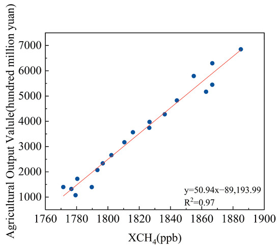 Scatterplot of XCH4 and agricultural production value in the Sichuan Basin area.