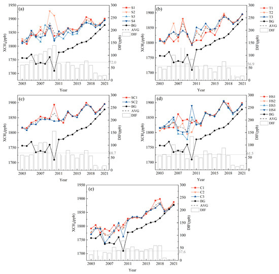 Changes in annual atmospheric methane concentrations in the oil and gas distribution area of the Sichuan Basin: (a) the shale gas zone; (b) the tight gas zone in western Sichuan; (c) the shale gas and conventional gas zone; (d) the high-sulfur natural gas zone; (e) the conventional gas zone.
