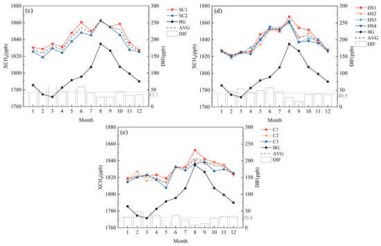 Changes in monthly atmospheric methane concentrations in the oil and gas distribution area of the Sichuan Basin: (a) the shale gas zone; (b) the tight gas zone in western Sichuan; (c) the shale gas and conventional gas zone; (d) the high-sulfur natural gas zone; (e) the conventional gas zone.