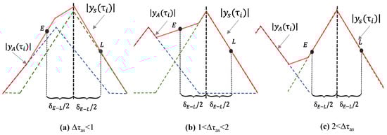 It is worth noting that represents discrete time indexes, which is related to the estimated parameter . When takes different values, a sequence of local replica elements with incremental time delays D is constructed, forming a post-correlation vector . Here, N is the number of correlator taps, which can be rewritten as follows: