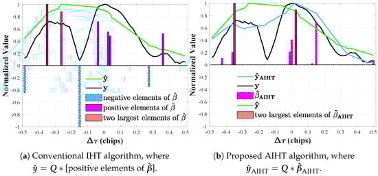 Furthermore, as shown in Figure 4a, the IHT algorithm reconstructs the envelope , closely matching the distorted outcome affected by thermal noise, including several negative elements. Referring to the procedure outlined by [10], if negative elements are discarded, the two largest positive elements (red bars in Figure 4a) would be interpreted as the code phases and of the two main signal components; however, as shown by the green line and red bars in Figure 4a, neglecting the negative elements not only introduces significant error into the reconstructed result , it also causes and to be inaccurate.