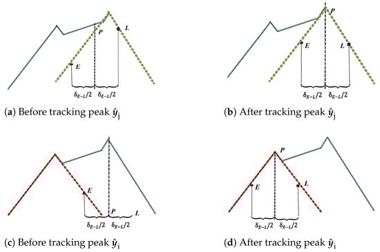 Based on the aforementioned iterative correction steps, as shown in Figure 5a,b, represents the green correlation triangle, which the DLL progressively tracks. Similarly, in Figure 5c,d, represents the red correlation triangle, and the second channel tracks it after correction. Thus, two separate channels within a pair track the genuine and spoofing peak components of a spoofed satellite signal. This simultaneous tracking enables the possibility of exploiting the inherent inconsistencies in spoofing signals, providing an essential foundation for designing position recovery methods.