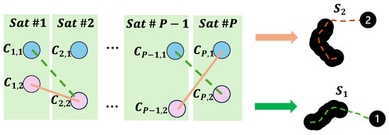 Because the receiver calculates position periodically, each produces different position trajectories over time. These trajectories, representing discrete position solutions, form unique sets. In Figure 6, each set is labeled , where corresponds to a particular channel selection scheme; thus, there are distinct sets, with each set representing a specific selection scheme. Among all these selection schemes, there exist three different scenarios: