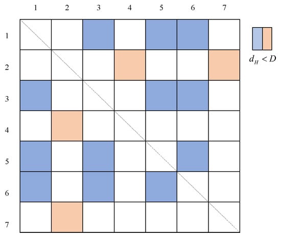In order to range the distance and compare the similarity between two sets between different position sets, the Hausdorff distance [26] is adopted. Let the bth and cth channel selection scheme corresponds to position set and , respectively, where and . Then, the Hausdorff distance between and is defined as