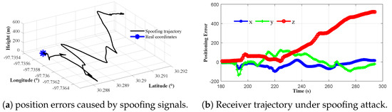 In this section, the position recovery performance of our algorithm is fully evaluated under the scenario 4 in TEXBAT, where the spoofing attack is initiated at 190 s and gradually introduces a 600 m erroneous position offset in the earth-centered earth-fixed (ECEF) coordinates. The true coordinates of the receiver in the WGS84 coordinate system are known to be latitude , longitude , and altitude 170 m.