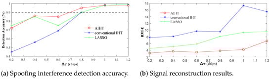 Figure 9a compares the detection accuracy of our AIHT algorithm against the conventional IHT and LASSO methods. To achieve 90% accuracy, AIHT can detect spoofing for delays as small as chips, whereas both IHT and LASSO require chips under the same criterion. Figure 9b displays the root mean square error (RMSE) between and the reconstructed result under different algorithms. Collectively, the proposed AIHT algorithm not only maintains a satisfying detection rate in a small code phase gap between the authentic and spoofing peak components, it also has the smallest reconstruction error, implying outstanding ability to recognize the corresponding code phases and of different signal components.