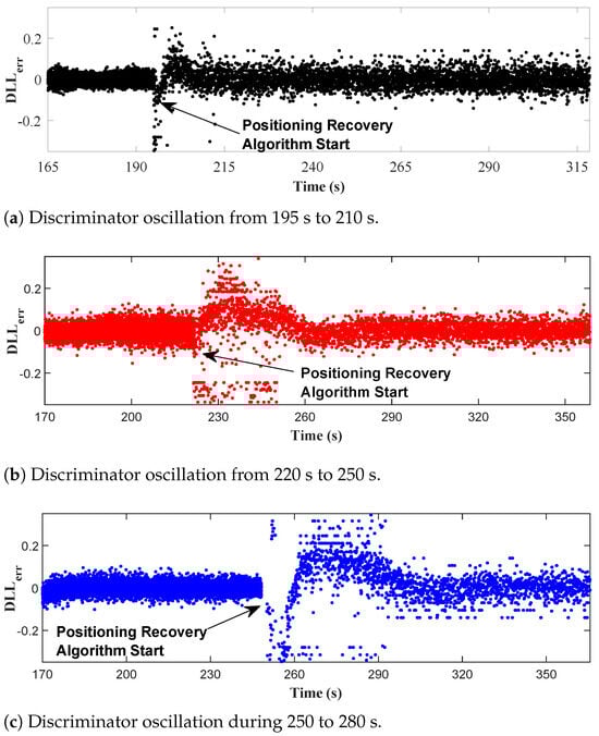The two main objectives of this article are to achieve accurate detection of spoofing interference and to ensure stable position recovery results under different spoofing conditions. To achieve the first objective, as discussed in Section 4.1, spoofing detection accuracy is evaluated by comparing the RMSE between and the reconstructed by the proposed AIHT-based detection method and other algorithms, for which we use publicly available datasets across several different scenarios. For the second objective, as outlined in Section 4.2, the effectiveness of the position recovery algorithm is indirectly evaluated by analyzing the tracking performance of each channel pair during the classification phase. Because smaller DLL discriminator fluctuations indicate a more stable AIHT-based APT algorithm, Figure 10, Figure 11, Figure 12 and Figure 13 show that the discriminator quickly regains stability during loop correction, validating the potential for successful position recovery.