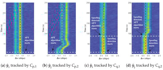As shown in Figure 10, during the time periods of 195–215 s, 220–250 s and 250–280 s, the oscillation amplitude decreases and the DLL loop tends to stabilize after tracking and alignment with the target signal component or . Upon detection of spoofing signals, AIHT-based APT algorithm begins. Figure 11 depicts the actual DLL correction process of the proposed AIHT-based APT algorithm for different values of . The tracking process in channels and , illustrated in Figure 11a,c, respectively, gradually locks onto , while the tracking process in channels and , detailed in Figure 11b,d, respectively, gradually locks onto , .