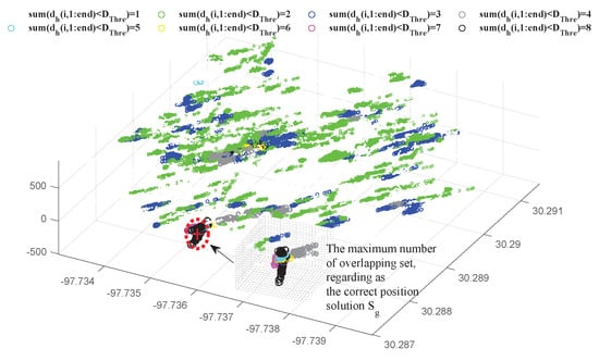 Collectively, there are P overlapping position sets , corresponding to authentic position solutions generated by authentic selection schemes. The remaining position sets produced by fake and mixed schemes are scattered, with relatively large distances between them.
