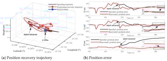 Three-dimensional trajectory and position error of spoofed and recovered navigation solutions from 160 s to 296 s.