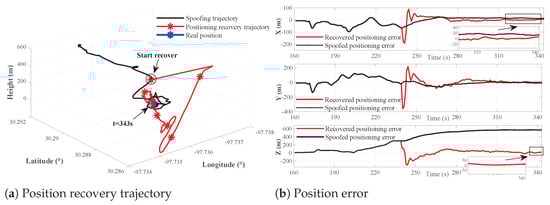 Three-dimensional trajectory and position error of spoofed and recovered navigation solutions from 245 s to 343 s.