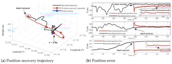Three-dimensional trajectory and position error of spoofed and recovered navigation solutions from 275 s to 378 s.