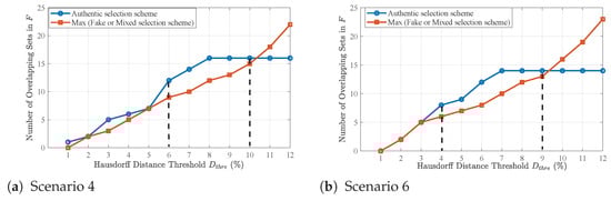 To validate the sensitivity of , we vary its value and check whether the proposed positioning recovery method still correctly selects the authentic scheme with the maximum number of overlapping sets in matrix F. For Scenario 4, values between 6% and 10% are effective, as shown in Figure 17a,b. When exceeds 10%, the number of overlaps from the authentic selection scheme no longer increases, as all relevant sets are already included; meanwhile, overlaps from fake or mixed schemes continue to grow. Therefore, if becomes too large, the recovery algorithm may mistakenly treats spoofed channels as authentic, leading to positioning errors. Similarly, for scenario 6, values between 4% and 9% are effective. Based on both cases, we set in our implementation.