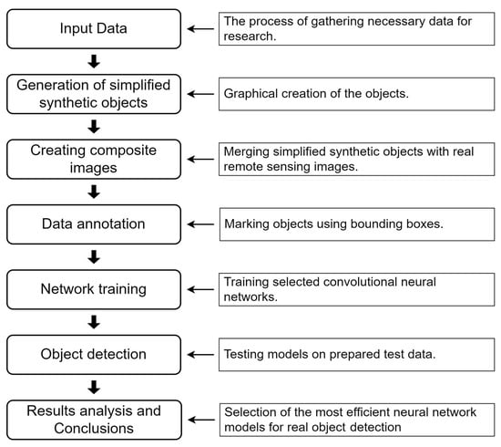 In our research, a series of activities, presented in Figure 1, were carried out, the aim of which was to obtain ready-made deep learning models for use in searching for objects at the bottom of water reservoirs. The presented diagram constitutes the individual basic stages of work related to the preparation and processing of data in the study. Seven main elements have been identified, which will constitute subsections later in this work. These sections will discuss the most important elements, concepts, and abbreviations used in this article.