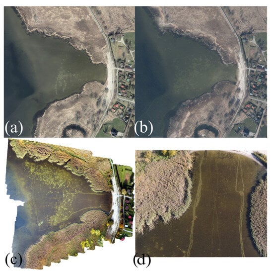 Raster data compilation used in the research: (a) aerial orthophoto (2021); (b) aerial orthophoto (2022); (c) UAV orthophoto (2022); (d) example of single UAV image (2022).